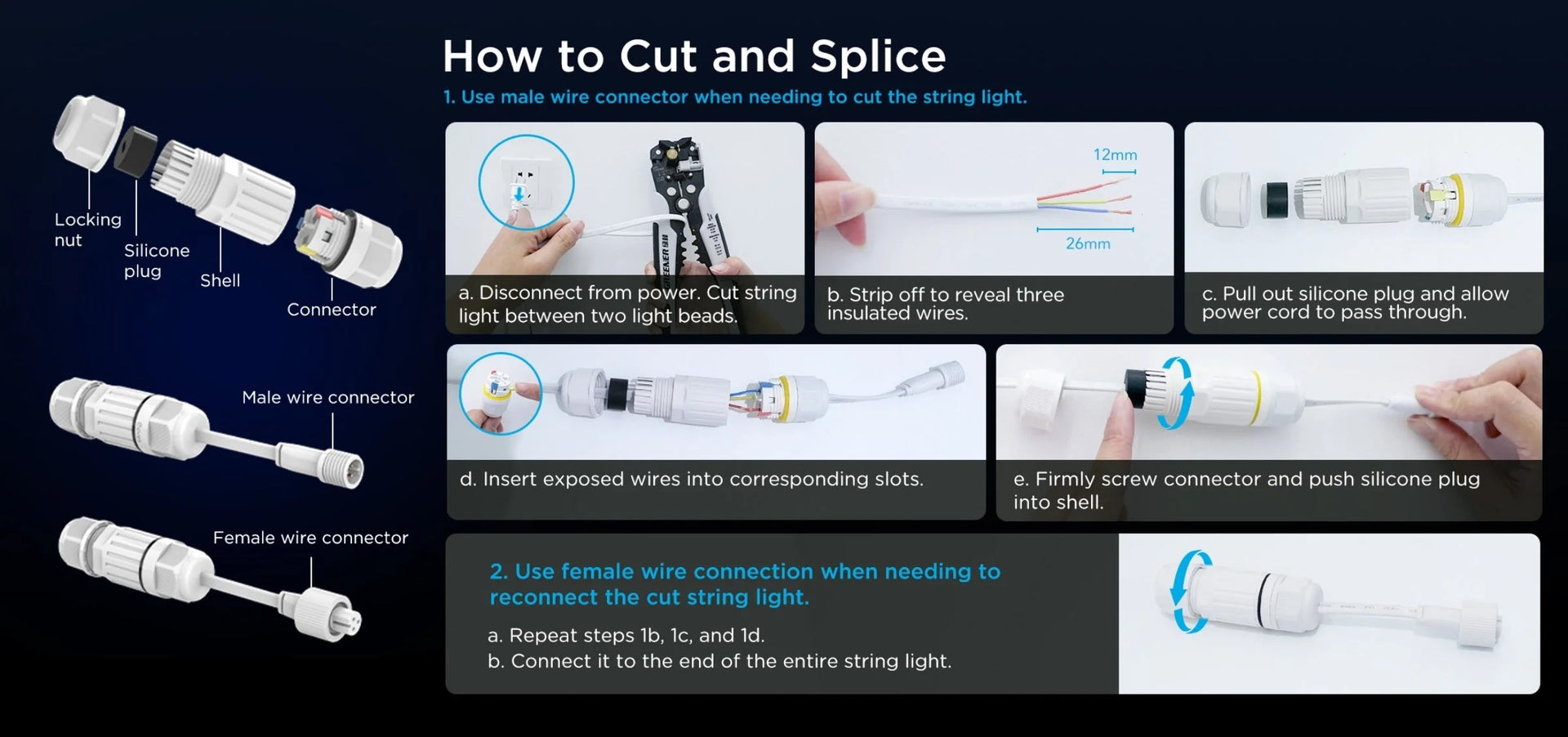 If you need a more precise size, you can cut and reconnect these lights by stripping the cable and feeding the wires into a silicone shell.