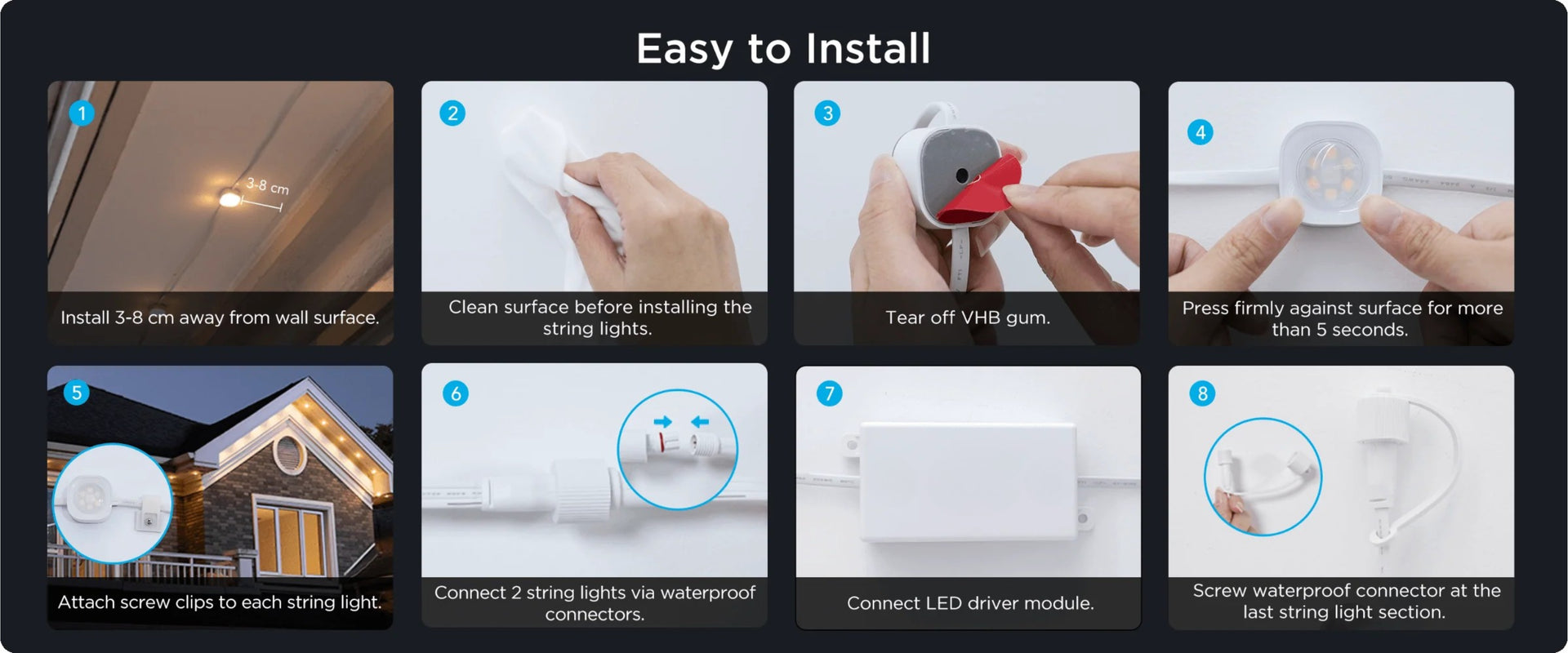 The installation process is a breeze with the provided VHB glue and clips, allowing you to set up each light in just 8 seconds.
